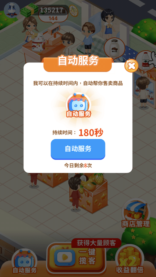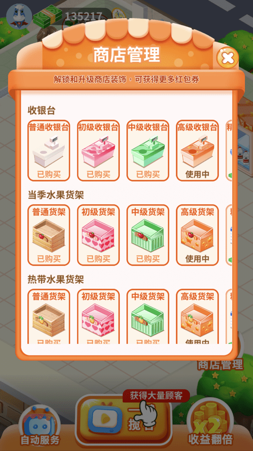 在游戏中,你作为水果店的老板,解锁新的货柜、装饰、售卖水果、蔬菜等商品;