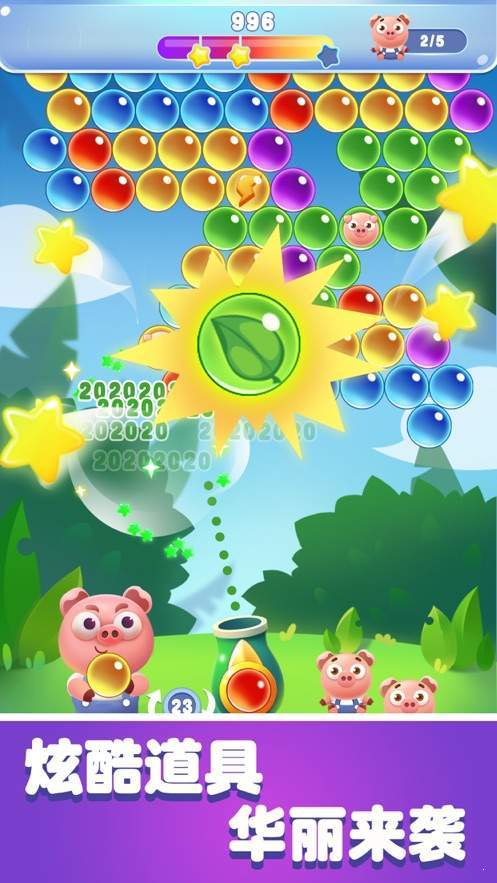 1.三个以上的泡泡可以消除,更多的道具辅助,让你的闯关更加简单。