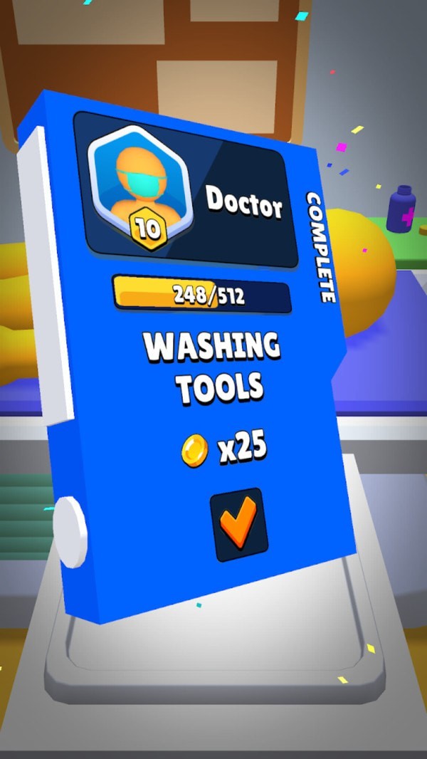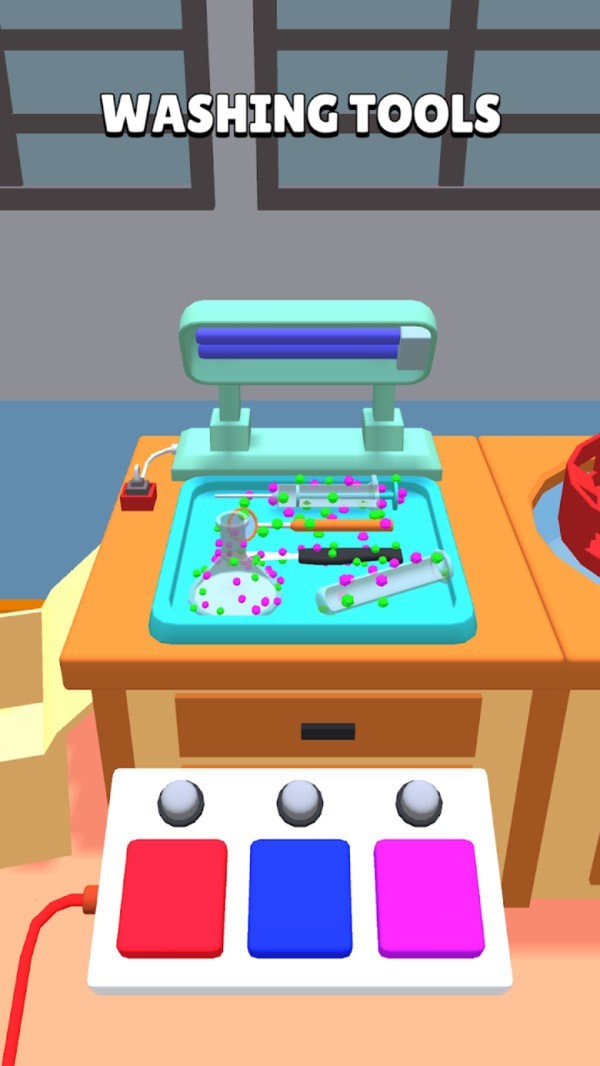 1、游戏内的画风很独特,根据简约3D的形式来进行打造,将医院里的内容进行设计;
