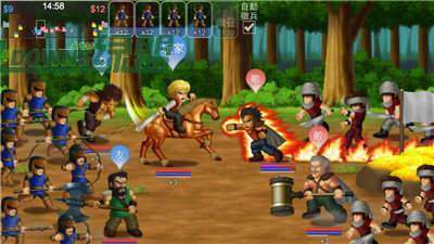 战争: 在战场上赚钱招兵、攻城夺营,与百人大战。