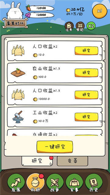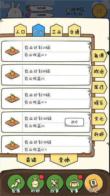 胖兔文明无限金币钻石版是一款发展文明类红包小游戏,胖兔文明无限金币钻石版游戏中玩家要将一个文明一个一个弄成强大的文明,先发展农业,让每一个人都能吃饱,然后壮大你的文明,带领你的子民向外扩张,还等什么赶快来下载游玩吧。