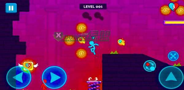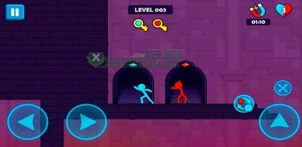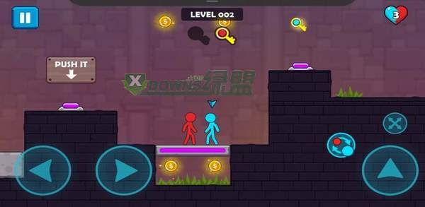 红与蓝火柴人是一款令人上瘾的益智游戏,您必须同步两个角色。同时控制两个火柴人,并使用按钮移动,推动箱子并收集硬币,游戏中有着不同的关卡和机关需要灵活的使用两个角色进行协作配合。