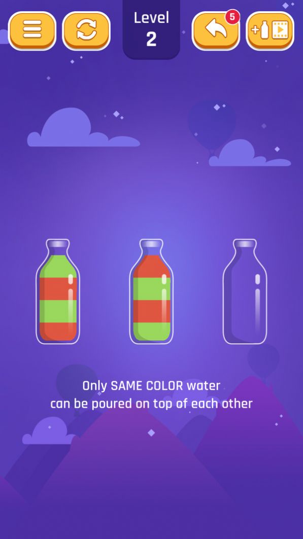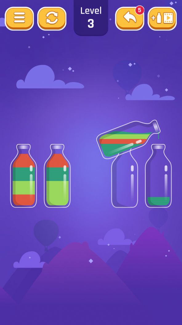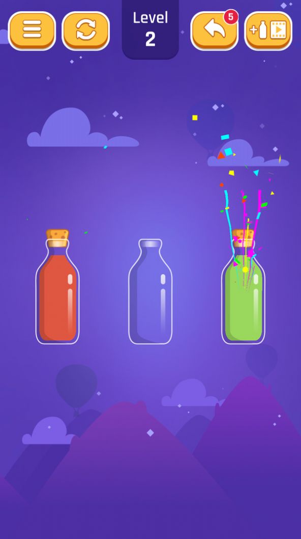 1、简单的操作玩法模式,你可以控制水瓶来倒入不同的液体,让液体变换不同的颜色;