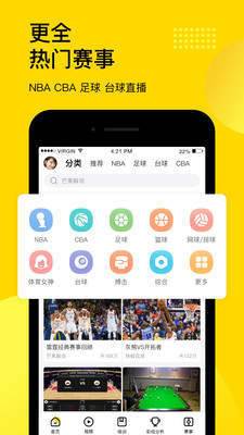 体育分类:NBA,篮球,足球,台球,乒乓球,网球,羽毛球,健身,舞蹈,赛车…,每一个体育分类下,均有主播在做体育直播。