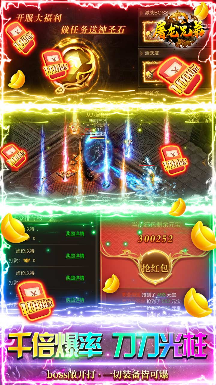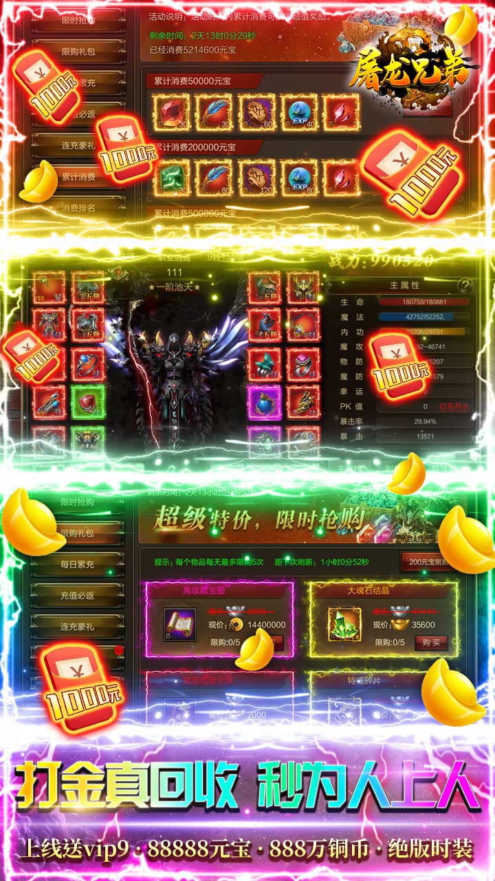 上线送vip10,元宝88888,铜币888万,绝版李小龙服饰,主线送充值、登录送充值、升级再送充值,BOSS敞开打,0氪也霸服。游戏回归传统1.76的打法,战,法,道经典三大职业,以装备和BOSS为核心,各系BOSS敞开打,神装必爆又回收,气势磅礴的沙巴克攻城带你回到充满挑战的奇幻传奇世界。 这里有经典版本的原汁原味,也有多人团战、激情pk的豪情,每一次登陆,都是激情成长的新篇章。