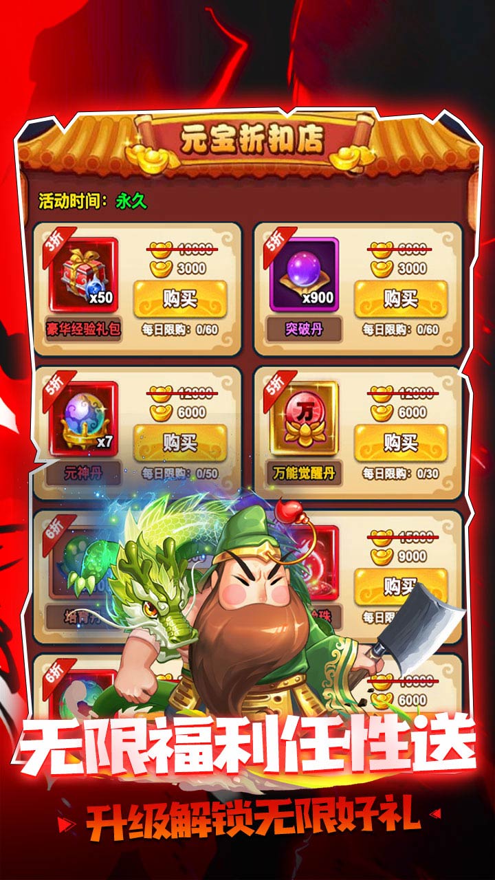 3.核心系统有着良好的深度玩法和武将付费系统。游戏以Q版三国为主,角色形象Q萌有趣,技能特效显眼风趣,交互精良、上手简单易懂。