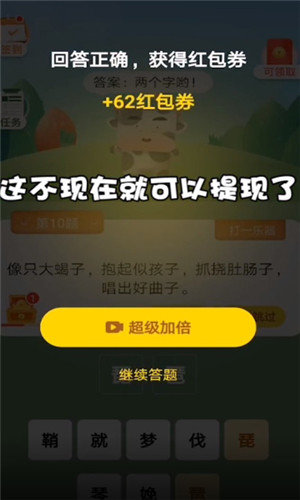 猜谜我最牛红包版是一款非常容易上手的答题闯关游戏,在这里挑战文学,历史等多个方面的知识,操作起来十分简单,更多考验玩家的智慧。顺利答对还能获得真金红包的奖励,收益百分百可以到账,玩游戏的同时还能赚取零花钱,绝对值得下载!