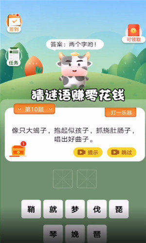 猜谜我最牛红包版是一款新颖好玩的赚钱领红包游戏,在这里丰富的游戏关卡内容,游戏中玩家你需要猜谜闯关,通过闯关和完成各种任务来获得更加丰厚的奖励哦,更多福利等你获得!