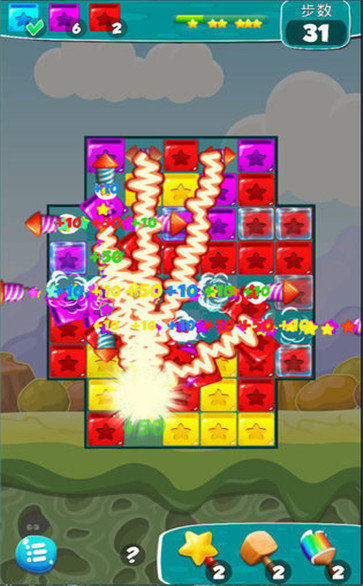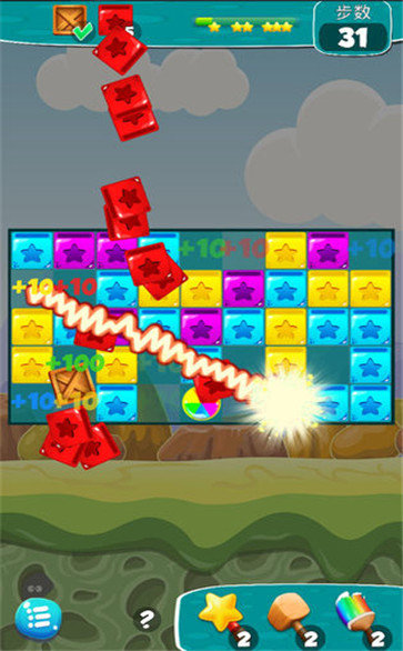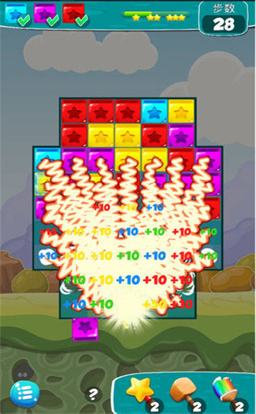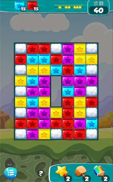 2、熟悉的叁消玩法在这里带给你刺激,我们一起用不同的道具或者是自己的点击,消除一些方块;
