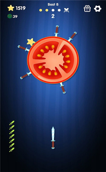 1、以简洁的卡通风格画面打造,玩法十分简单,点击屏幕发射飞刀,全部集中靶子则进入下一关;