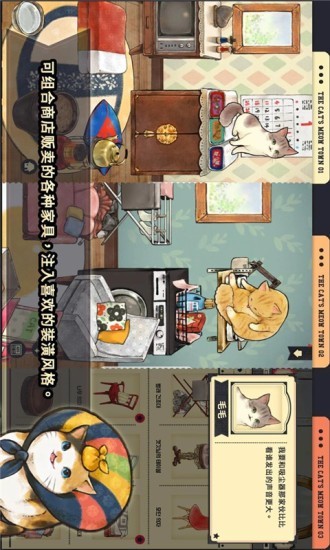 3、可组成店铺贩卖的各种各样家具,引入喜爱的装修设计风格。猫咪们也会应用屋子里的家具入睡或理毛。和猫咪越来越亲密接触,就可以获得店铺未贩卖的猫咪专用型家具。每每放置家具时,就能见到猫咪们对家具的评价语,这也是不能错过了的快乐!