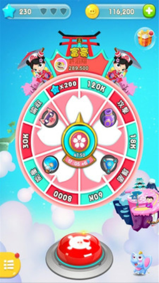 进入游戏后的界面是这样的,有一个大转盘,上面有对应的金币数量,还有其他的辅助道具,通过辅助道具来协助获得更多的金币。