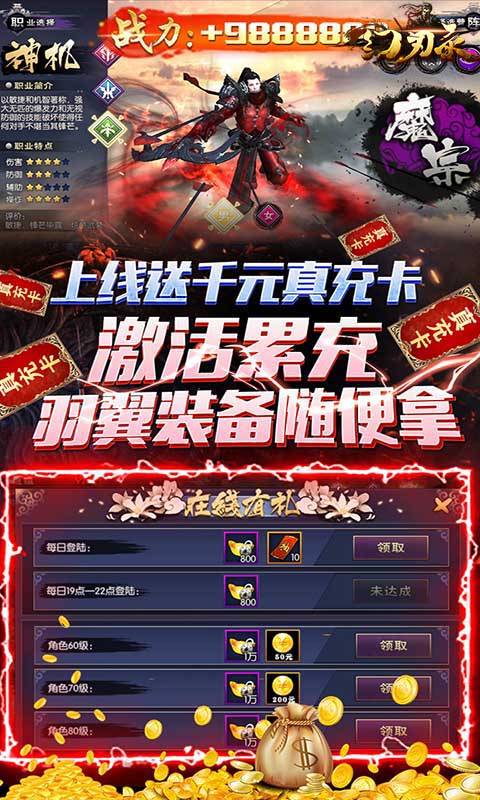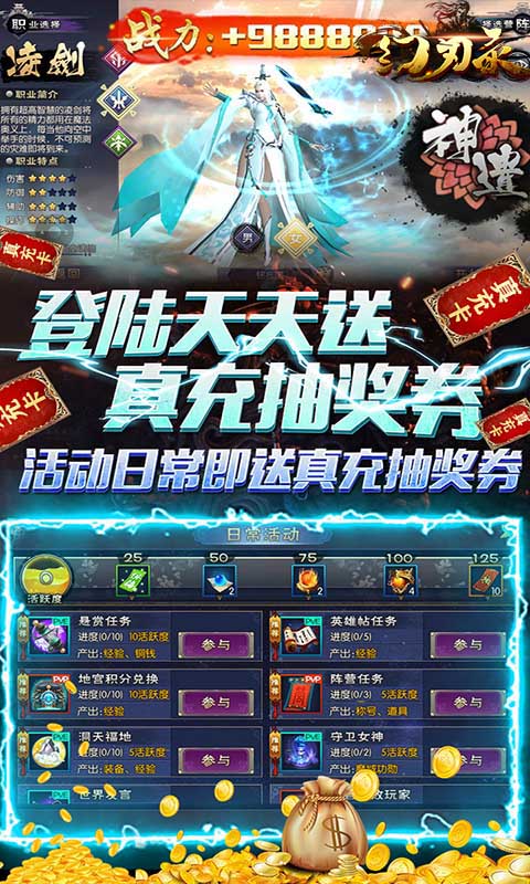幻刃录送大额真充卡是一款变态福利版本仙侠手游多种游戏模式,游戏有着丰富的玩法内容,玩家可以选择喜欢的职业加入战斗进行pk,极具代入感的故事背景开启古神话世界,上线还送海量福利哦。