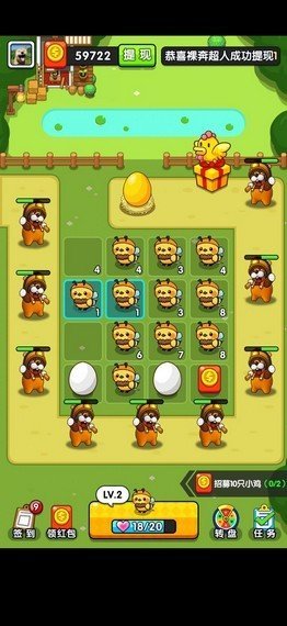 2.游戏是经典的合成玩法,同等级的小鸡合成,解锁更高等级的小鸡。