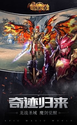 暗黑魔魂,一款大型西方魔幻RPG冒险手游!龙战圣域,魔剑举行,奇迹归来!万人在线,千人团战,嗜血团战,跨服争霸一起争夺宝物,体验多人同屏激战的无限快感!还能和伙伴一起组队下副本打宝,超高爆率,神装好打,还能自由交易转职,特色变身,暴怒输出,快感加倍,非常爽快哟~