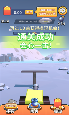 最强炮手红包版是一款超简单好玩的线上闯关游戏轻松赚红包奖励,争取做到一击必杀,这样子进入到评分环节的时候你就可以轻松的获取到各种各样的分数了,进行合理而又精准的瞄准能够让你在射击的时候耗费更少的炮弹,对这款游戏感兴趣的小伙伴快来下载吧。
