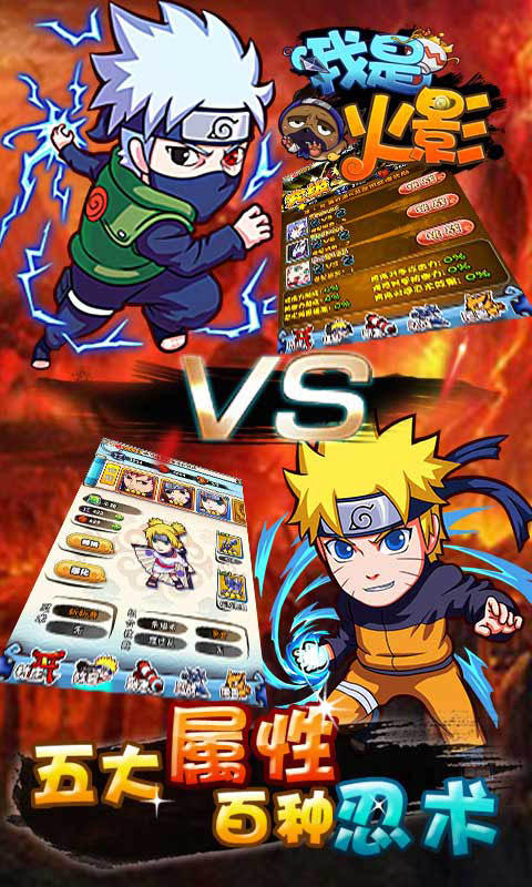 1.Q版游戏画面,倾力打造精英级别的火影游戏!5大属性相克,让忍者间的对决更有策略性!