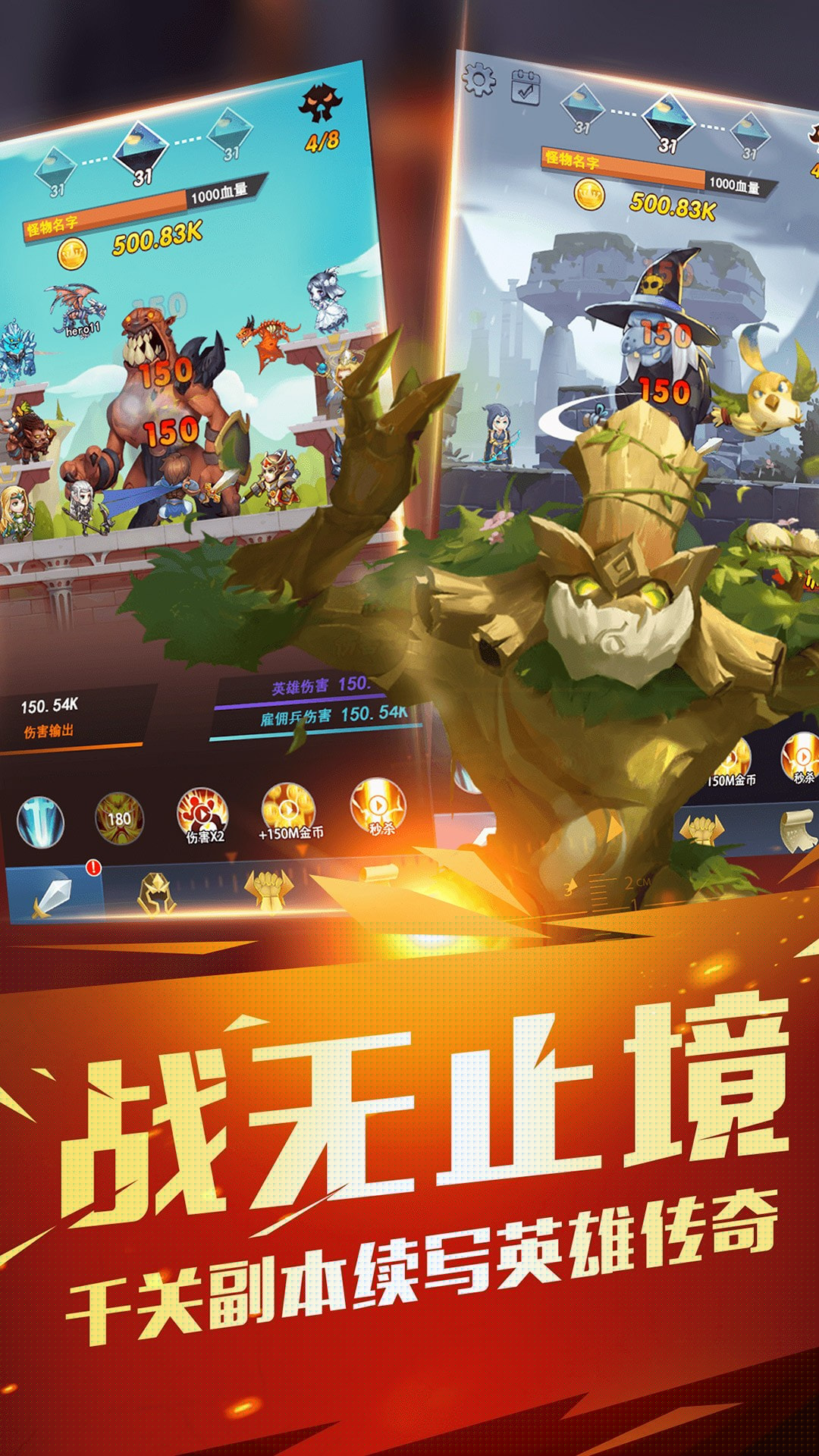 轻松的闯关养成类型游戏,在游戏中玩家可化身为一名征战的英雄,击败你面前的一个个强大的怪物。 击杀每一个怪物都会获得相对应的金币奖励,玩家可以用游戏中获得的金币用来提升英雄的自身能力,或者学习技能。甚至玩家也可以选择召唤佣兵来协助自己,从而更有顺利的解决战斗。