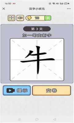 游戏中会给出不同的文字,而玩家需要在这个文字的基础上添加一笔让这个字变成一个新的字;