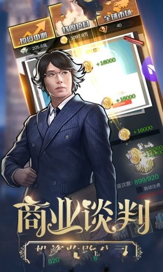 在金牌富豪手游白手起家,一步步进入商界精英领域中,建立公司,逐步成为世界五百强!