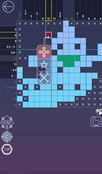 游戏中您根据数字提示填充网格中的方块,随着游戏进行,您将慢慢显示隐藏在网格中的图画。