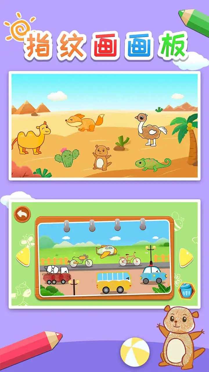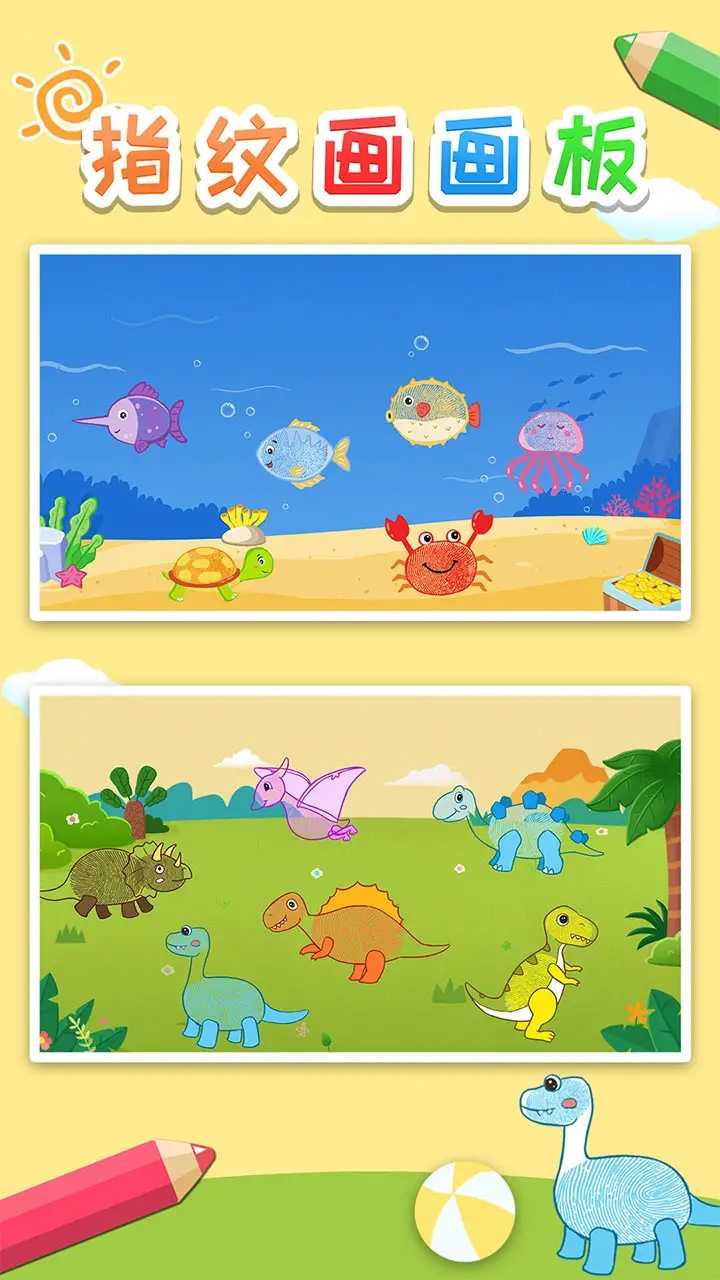 指纹画—用手指在屏幕上点一点印出指纹,用指纹画出小花,小动物,小丑鱼等,操作简单有趣,无论男生还是女生都能够轻松学画画,激起孩子绘画的艺术潜能。