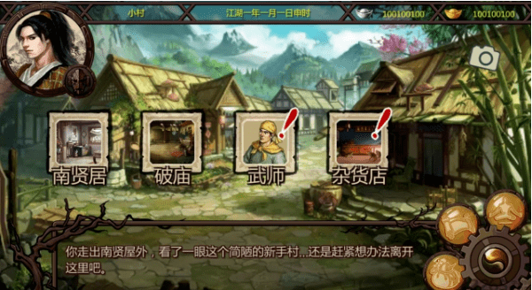 开始游戏时主角进入新手村,可以练级、触发剧情。找南贤可以离开新手村。