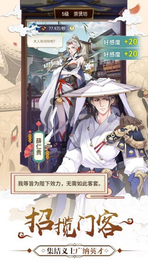 2、招募更多的门客来提升自己的能力,让更多的人才来自己的麾下,这样你的办案能力也会得到进一步的增加;
