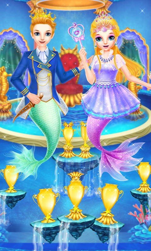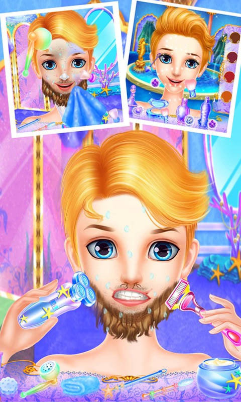 美人鱼公主和王子将要举行他们盛大的婚礼了。赶紧帮助他们来化妆打扮吧。首先,你需要帮助公主清洗头发和脸部肌肤,去除她脸上的痘痘和黑眼圈并给她做一个面部的熏蒸。修整她的眉形。然后,给她敷好面膜和眼膜。接下来你需要给公主擦上一点儿面霜,让她看起来更加光鲜亮丽。完成游戏的每一步,你都可以得到一座奖杯。第二步,你需要给公主化妆打扮,用我们为你准备好的各种化妆品来给公主化一个精致的妆容。选择适合她的粉底颜色和眉形,用唇彩和腮红来修饰她的妆容。第三个游戏阶段,你需要用漂亮的衣服和饰品来打扮公主了。给公主挑选合适的礼服和发型来让她满意。接下来你需要用同样的方法来为王子化妆打扮了。可以通过玩小游戏来赚取足够的金币来开启游戏。最后将打扮好的王子和公主展示给我们吧。