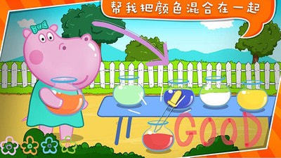 2.这么多美丽的颜色呀,可是宝宝的河马只想要得到它手里的颜色,我们需要把桌子上美丽的颜色混合起来,让宝宝河马得到自己想要的的颜色。