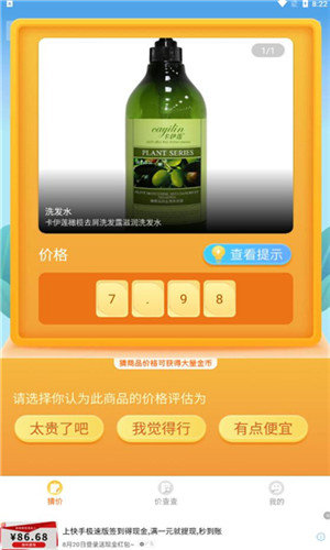 价格猜猜猜赚钱版是一款通过猜物品价格来闯关赚钱的益智游戏,这里涉及到比较多的日常生活物品,看你能否知道它们的价格,不断累积收益就可以轻松提现了!