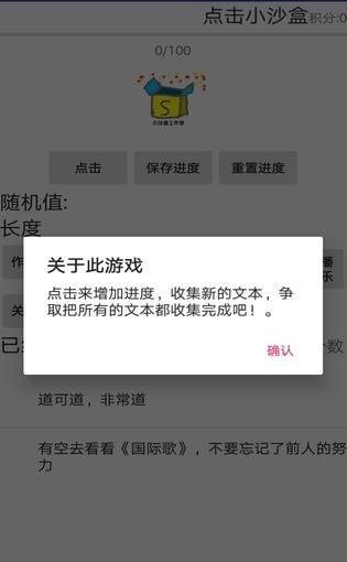 玩法:点击来增加进度,然后进度满100 会获得一句我写入的文本。
