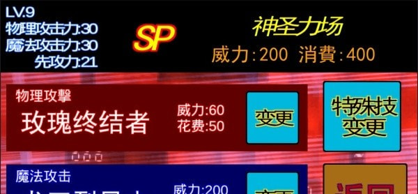 攻击方式分物理和魔法攻击,特殊技等,HP和MP其中之一为0即GAME OVER,根据战斗中的表现决定过关后的经验值和金钱获取,有一定策略性。