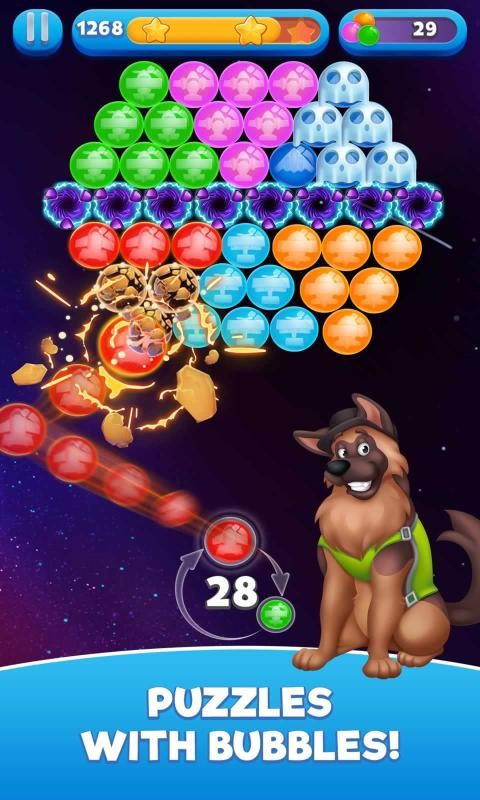 1、越来越具有挑战性的谜题和射击气泡弹出的目标,匹配3个或者3个以上的泡泡完成一次完美的爆炸;