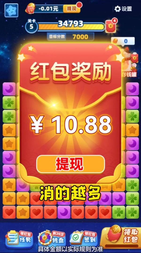 来玩消消乐红包版,一款玩法轻松简单的消除闯关类休闲益智手游。在这里玩家需要根据关卡任务目标进行消除对应颜色的方块,其中包括普通消除和特效消除,跟常规的消除游戏玩法一致但是玩这款游戏还能赚钱。