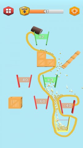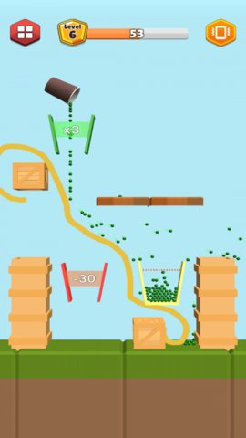 玩家需要通过画线,让小球不断的撞击画出的线条,然后让小球可以成功的掉入收集小球的桶中。