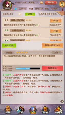 三、功法问题:功法目前版本分为两种,一种是你加入的门派去学习(无论等级的门派都有攻击、防御、攻击速度、闪避、雷抗这几个技能,前期建议学门派的攻击和防御技能),二是你可以在右上角的鬼市的仙书坊花灵石去购买学习。门派学习技能需要技能点,购买的书你可以无限学,所有建议多攒灵石买书堆攻防属性。