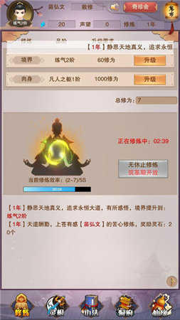 一、新人进游戏需要手动点击修真,直到筑基完成后才会自动增加修为,筑基完成后无论在不在线都可以涨修为,修为累计无上限,修真境界越高每秒增加的修为越高,有能力的玩家可适当选择在珍宝阁购买青云决、青云心法。青云决增加每秒的修为,青云心法增加每秒的灵气。