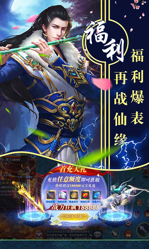 超值首充大礼,送价值188888元豪华礼包:极品橙武、绝版战骑、永久激活黄金仙令卡等超多材料;