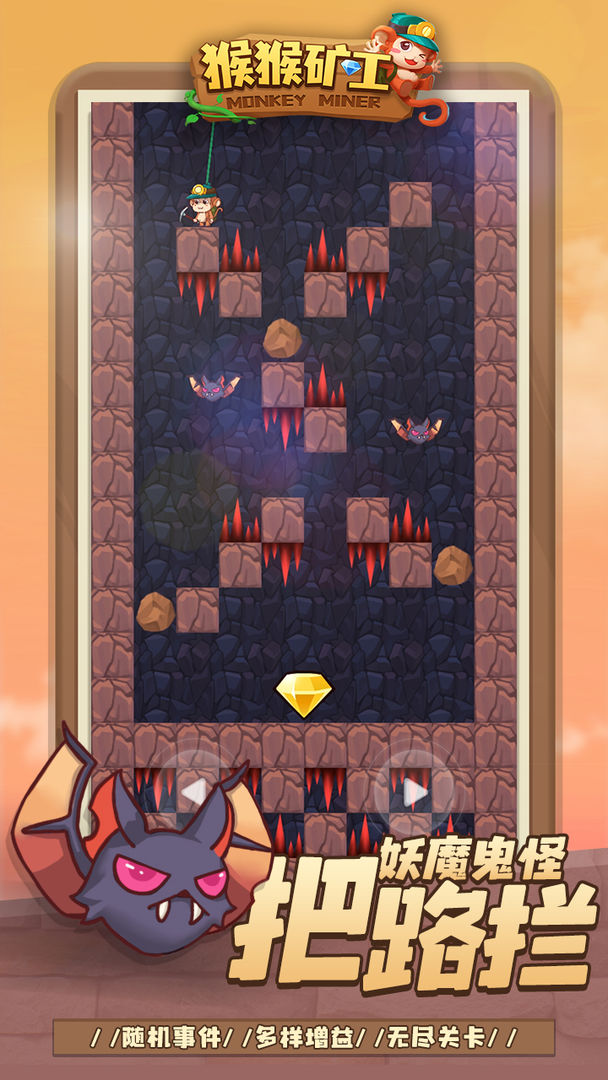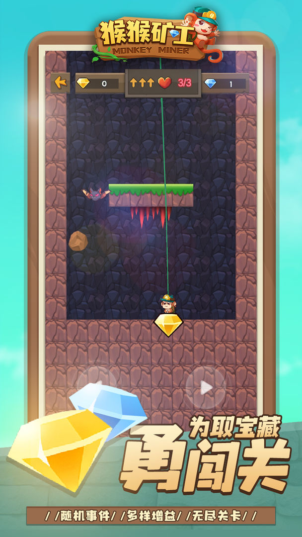 猴猴矿工是一款休闲闯关游戏,拿上铁镐走进山洞冒险,避开障碍,寻找宝石和钻石,这些可以升级装备和节技能,让小猴子能走的更远,关卡随机,可无限冒险,操作简单,非常适合休闲娱乐,感兴趣的小伙伴们快来下载吧。