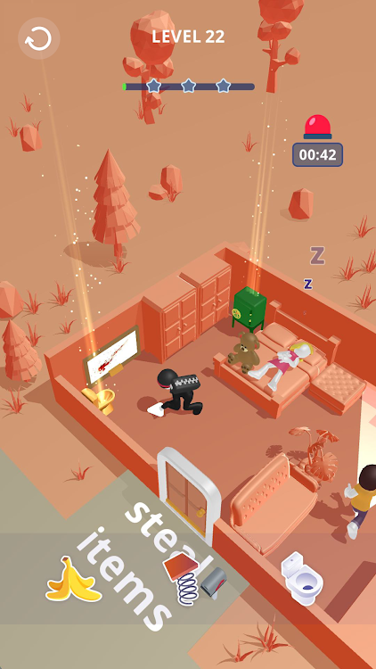 控制一个小偷去窃取各种各样的物品,完成关卡任务就可以领取到丰厚的奖励。