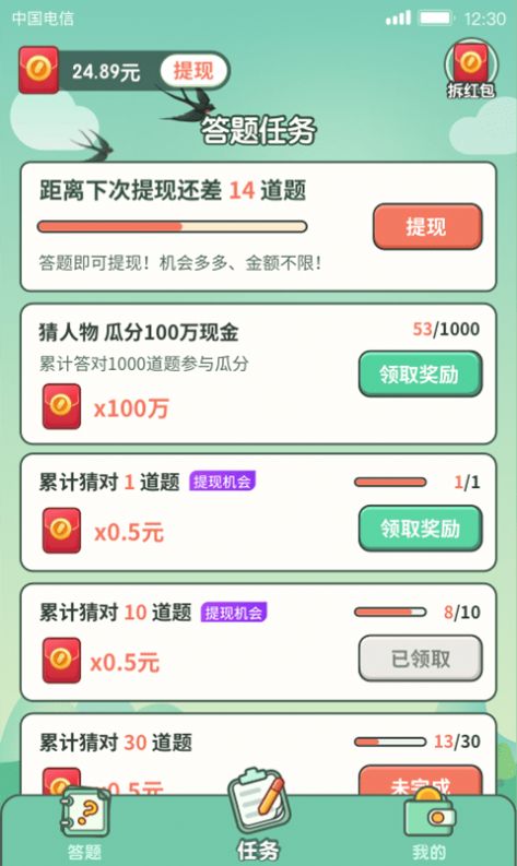 自由闯关答题的热门小游戏,这里操作模式非常简单,而且融合了特色文化,让你在闯关中学习并且还能赚零花钱,轻松答题领红包,随时开启答题之旅。