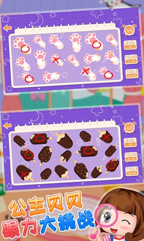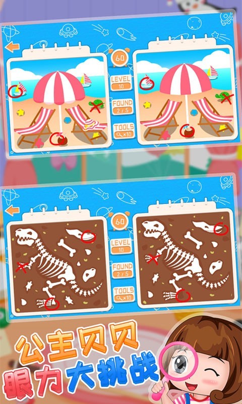公主贝贝眼力大挑战红包版是一款有趣的休闲益智类游戏,这款游戏的玩法非常的简单,但是非常的看要玩家的眼力,玩家要在两张几乎完全相同的图片当中去寻找出不同的地方,所以着是对玩家眼力的一种考验,当你在寻找不同之处的时候一定要仔细的观察图片的细节之处哦。