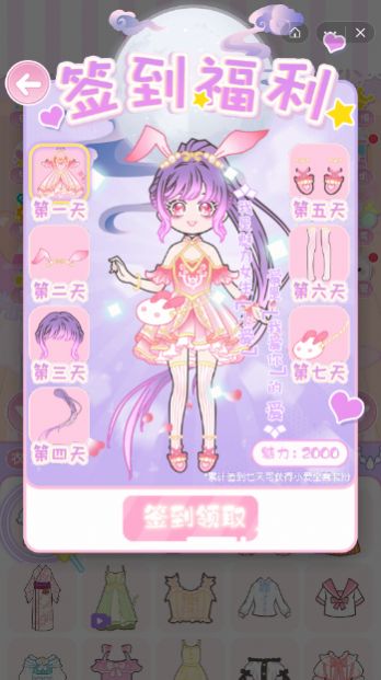 1、每天上线可以签到领奖励,各种好看的款式服装免费拿,让你有穿不完的衣服;