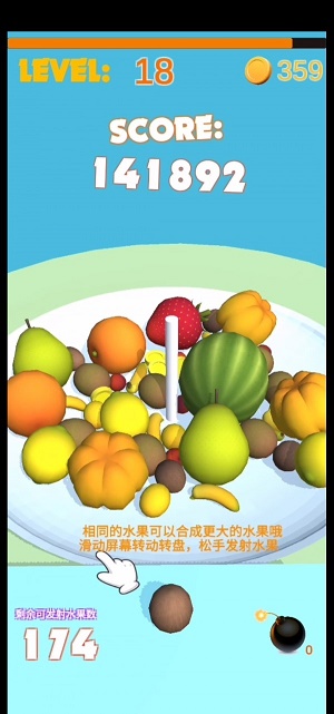 滑动屏幕旋转场景中的大瓷盘来调整位置,松手即可向瓷盘中心发射水果。相同的水果可以合成,有连击模式,在连击时可以获得成倍的分数奖励哟。
