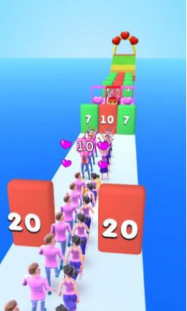 2、通过左右滑动屏幕控制情侣之间的距离,以躲避障碍或获得更多的情侣,走向终点获胜。