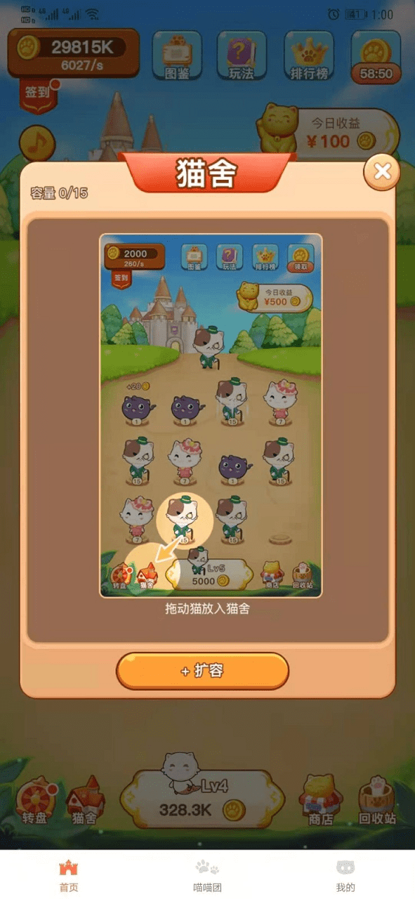 1、非常火爆的养成类游戏,你可以养殖各种品种的猫咪,然后出售赚钱,可以通过合成来让两只相同的猫咪合成为大的猫咪,解锁分红福利;