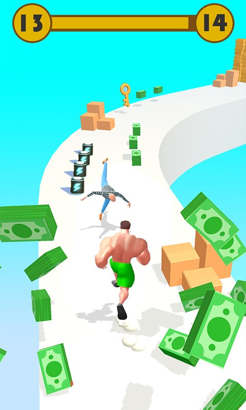 玩家奔跑的距离越远获得的分数就会越高,并且在这个过程中还可以释放出自己心中的压力,游戏的整体氛围紧张刺激,挑战模式多种多样可以自由切换,主角是一个浑身肌肉的健壮男士,我们需要灵活操控他的移动去完成挑战。
