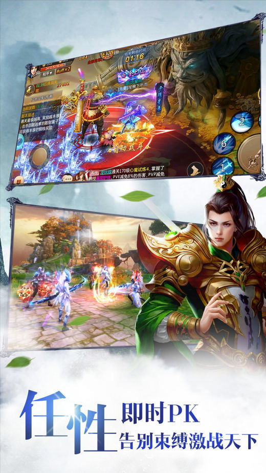 【经典创新,探索更多玩法】跨服无限制PK,万人同屏激战,统战操作极限一战成名,群雄对抗独占鳌头!真实爽快的打击手感、华丽震撼的技能特效,为你打造激燃的超强战斗体验。