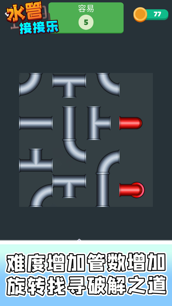 水管接接乐是一款休闲益智解谜类游戏,成为一名聪明的水管工,让散乱的水管出口和入口链接,顺利让水流通过,尝试使用最少的步数,多种关卡等待挑战。